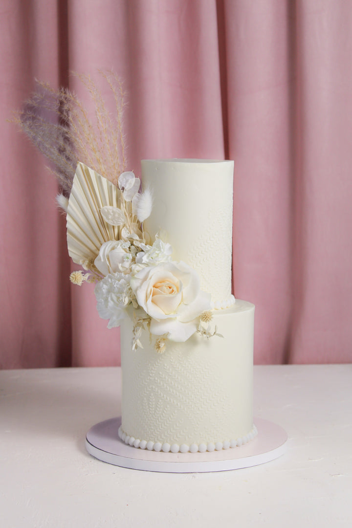Our Boho Chic cake features a smooth buttercream base with a stencil detail, a fresh floral, and dried floral accents. Please note that the stencil detail will be white for this cake.